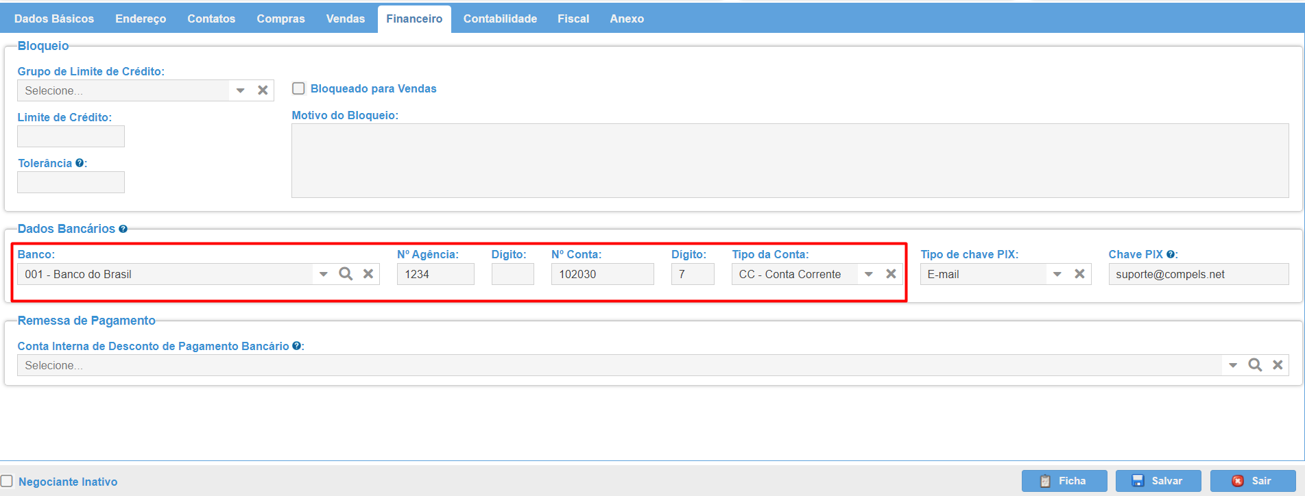 Vá na aba "Financeiro" e coloque os dados da conta bancária do negociante.