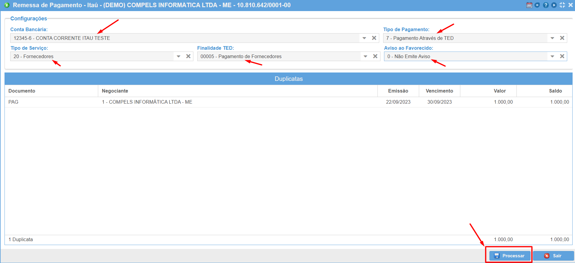 Assim que localizar a duplicata/documento, selecione a mesma e clique em "Processa Remessa".