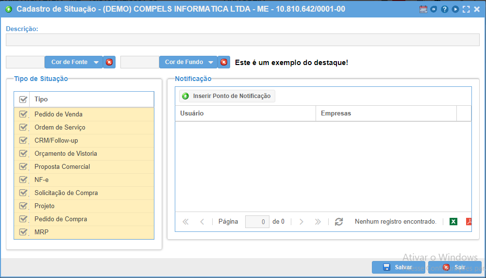 * Cor de Fonte: Campo onde pode se determinar uma cor de fonte para essa Situação;