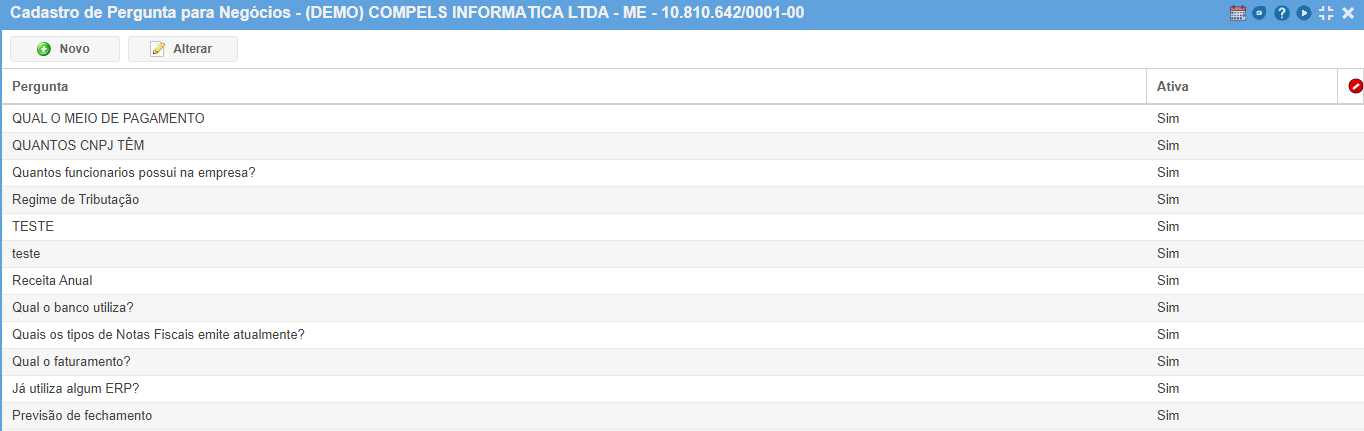 O Cadastro de Perguntas para Negócios consiste em criar perguntas que funcionarão como um roteiro posteriormente para ser utilizado no Tipo de Negócio.