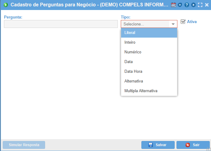 *Tipo: Nesse campo você deverá selecionar qual é o tipo de resposta para essa pergunta;