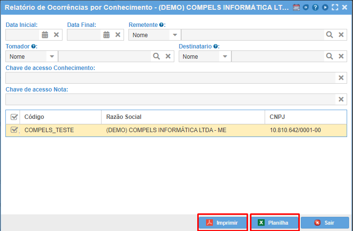 Para gerar o relatório preencha os campos e em seguida clique em "Imprimir" para PDF ou "Planilha" para Excel.