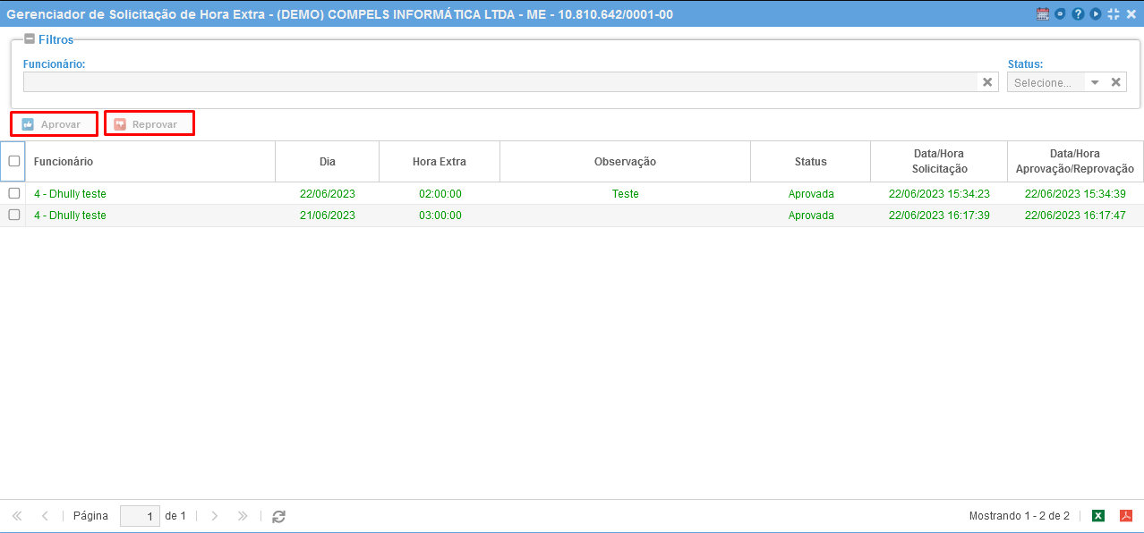 O responsável poderá "Aprovar" ou "Reprovar" as solicitações feitas.