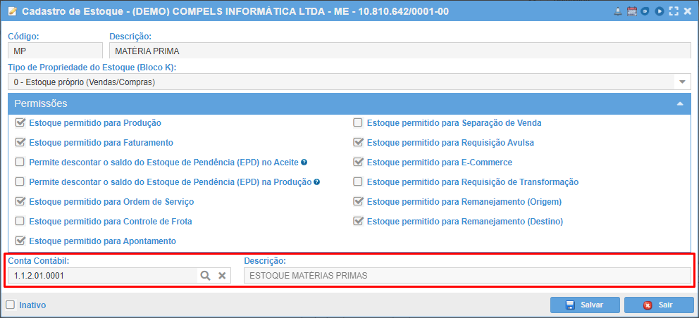 As configurações das contas são feitas apenas no cadastro de estoque, nos estoques necessários para essa integração. Segue abaixo um exemplo de onde informar a conta contábil: