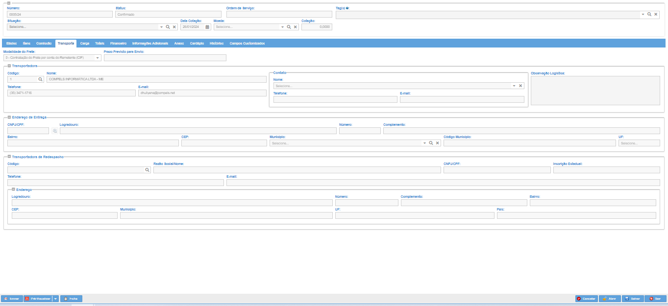 Modalidade do frete: Informar a modalidade, ou seja, se em caso de transporte será por conta do Cliente ou por conta do Fornecedor.