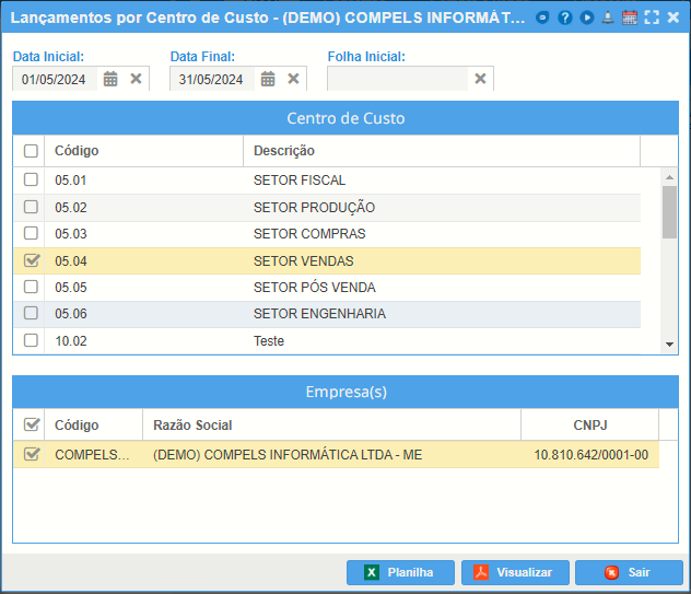 Centro de Custo: selecione o centro de custo que aparecerá neste relatório.