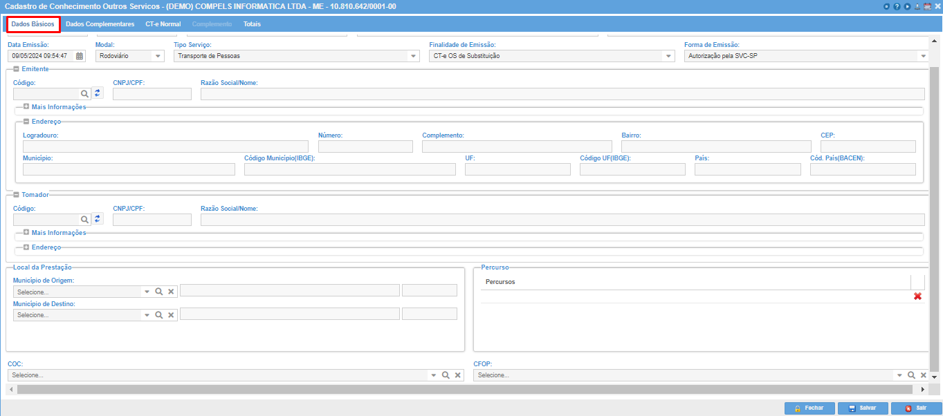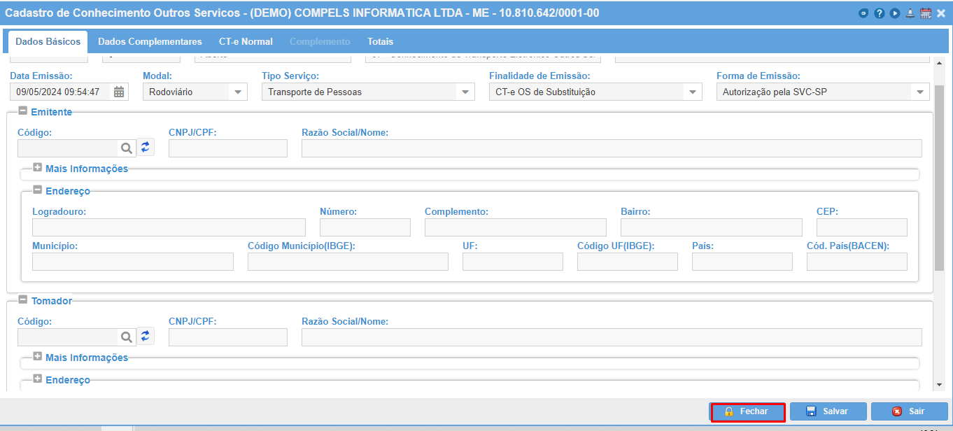 - Finalidade de Emissão: Informe qual a finalidade dessa emissão (CTe-OS Normal, CTe-OS de Complemento de Valores, CTe-OS de Substituição).