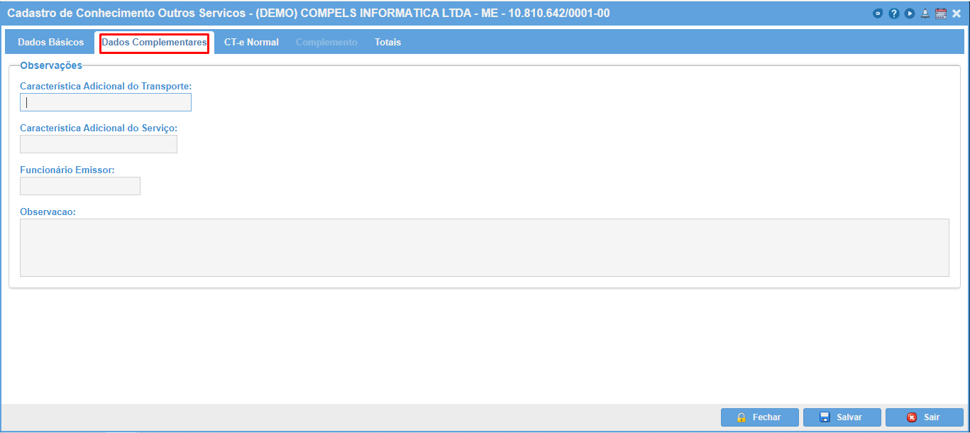 Caso tenha alguma informação complementar para inserir ao conhecimento como "Característica Adicional do Transporte, Característica Adicional do Serviço, Funcionário Emissor" ou caso tenha alguma observação.