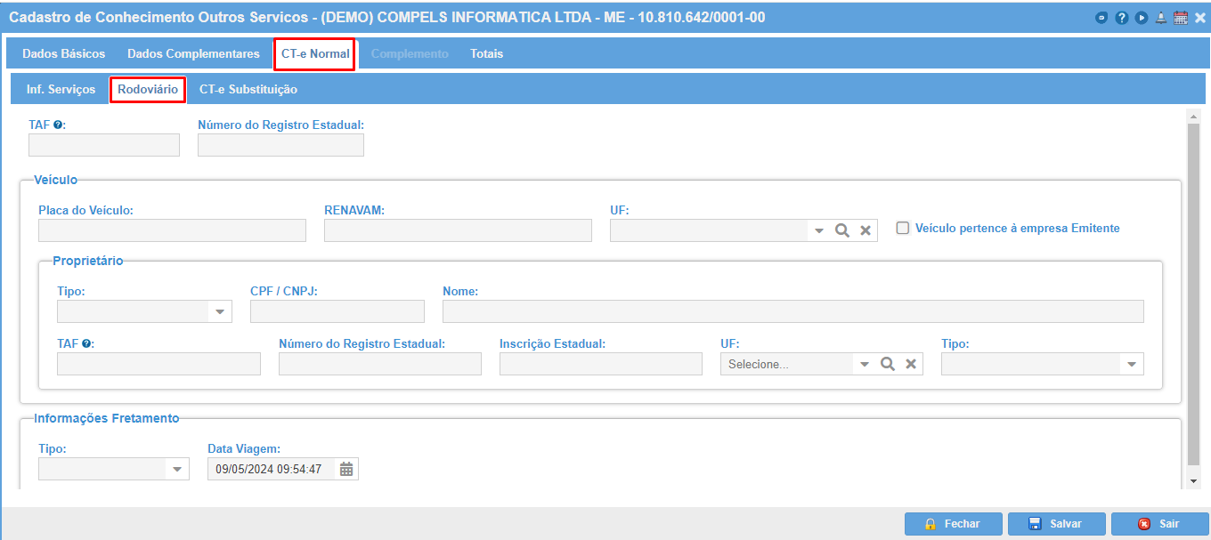 Insira as informações referentes ao rodoviário desse conhecimento, informações do veículo, do proprietário e do fretamento.