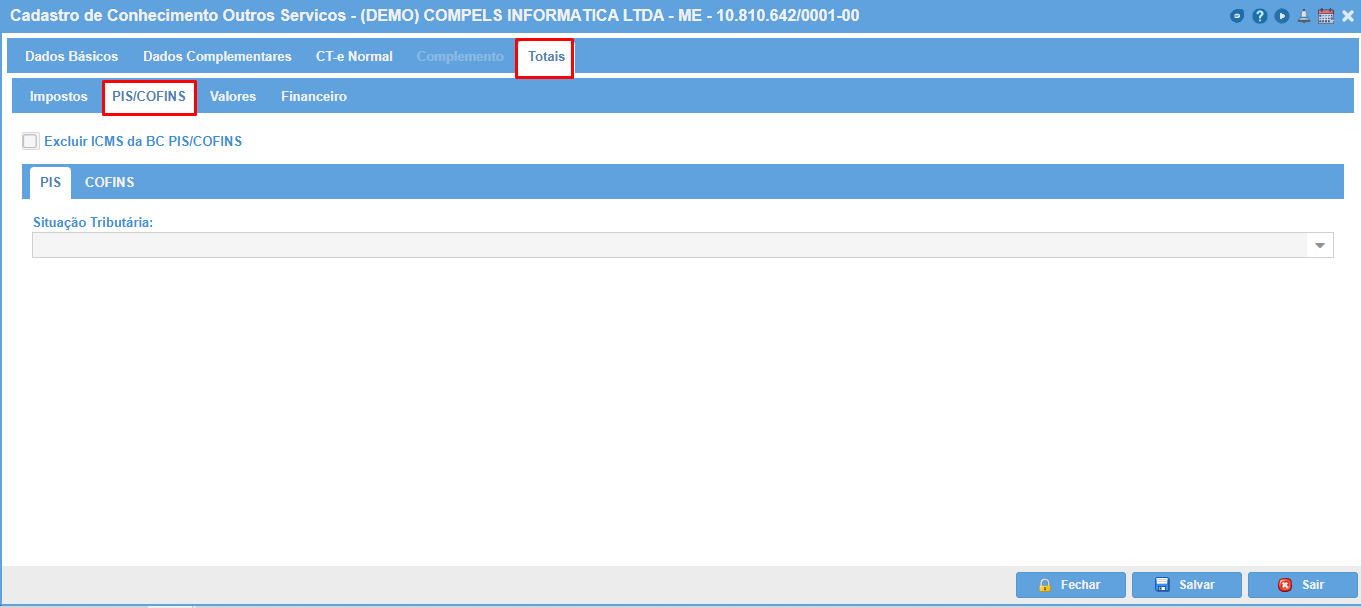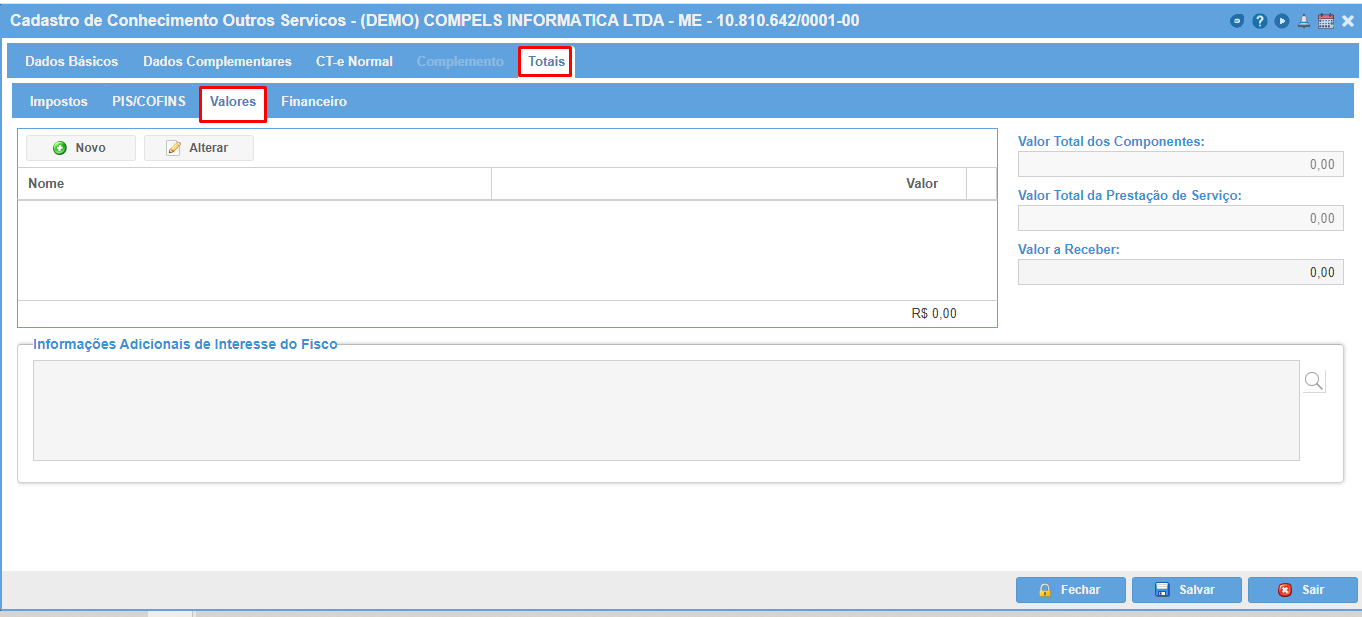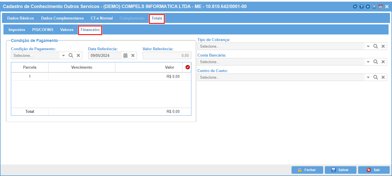 Aba onde é possível inserir informações como as de impostos, valores e financeiro referente a esse Conhecimento.