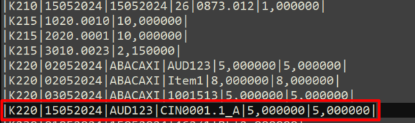 Registro K220 - Registro onde será informado os dados referentes a outras movimentações internas entre mercadorias, sem a cobertura de uma ordem de produção registrada. Dentro do ERP Easy, essas movimentações são os remanejamentos de estoque para atribuir saldo de um item para outro. Segue abaixo um remanejamento feito atribuindo saldo de um item para outro e como vai para o registro K220.
