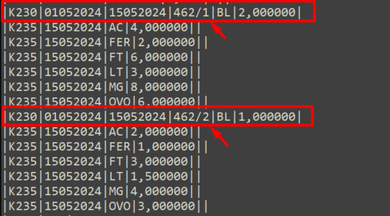 Os dois apontamentos da ordem de produção 462. Veja que na montagem desse registro, a cada apontamento da mesma ordem de produção é colocado uma barra e a sequência de apontamentos, ficando: 462/1 e 462/2.