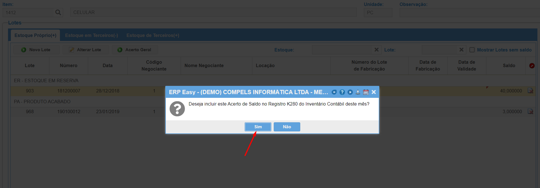 Vamos diminuir o saldo para 40 e ao clicar em "Acertar", aparecerá a mensagem se é para incluir no registro K280. Vamos clicar em "Sim".