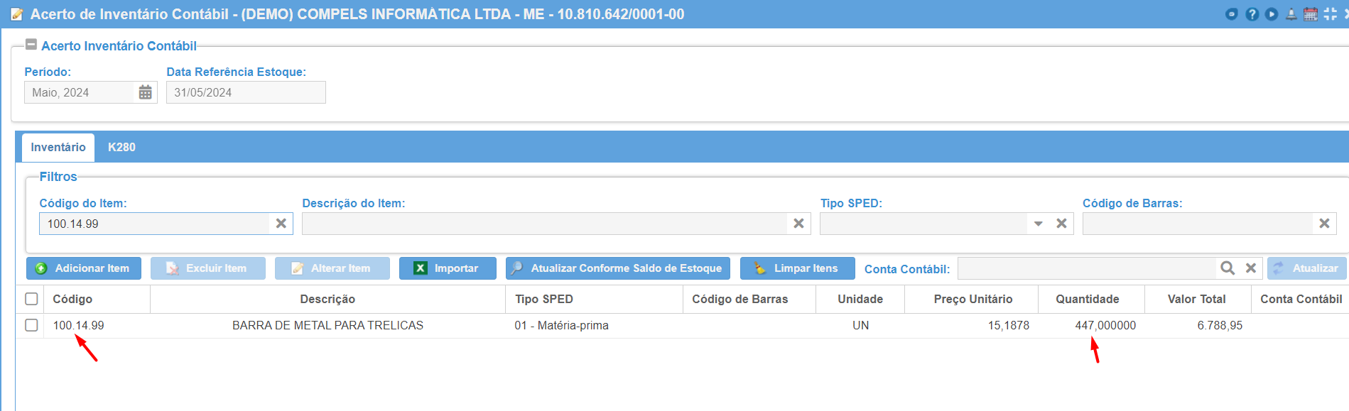 Se acessarmos a funcionalidade "Acerto de Inventário Contábil", irmos no inventário do mês que vamos gerar o SPED e ir na aba "K280", o item que fizemos o acerto manualmente deve constar no inventário com a quantidade negativa de 10 unidades.