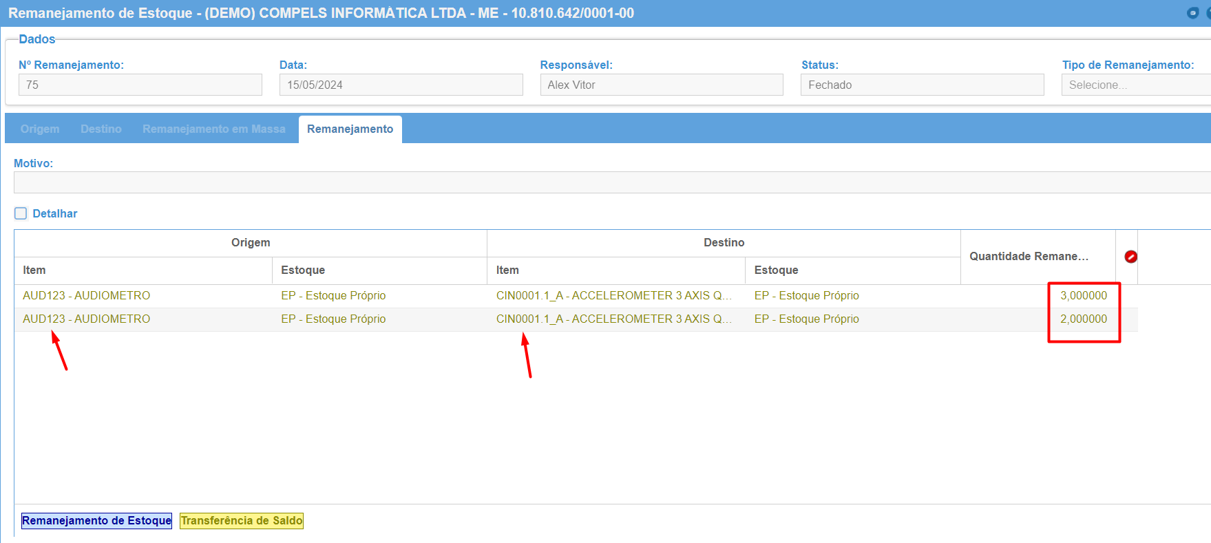 Remanejamento de 5 quantidades do item AUD123 para o item CIN0001.1_A.