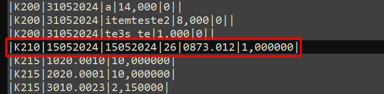 As informações que vão para o registro K210 são o número da desmontagem, a data, o código do item e a quantidade.