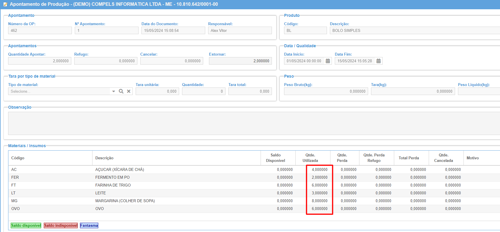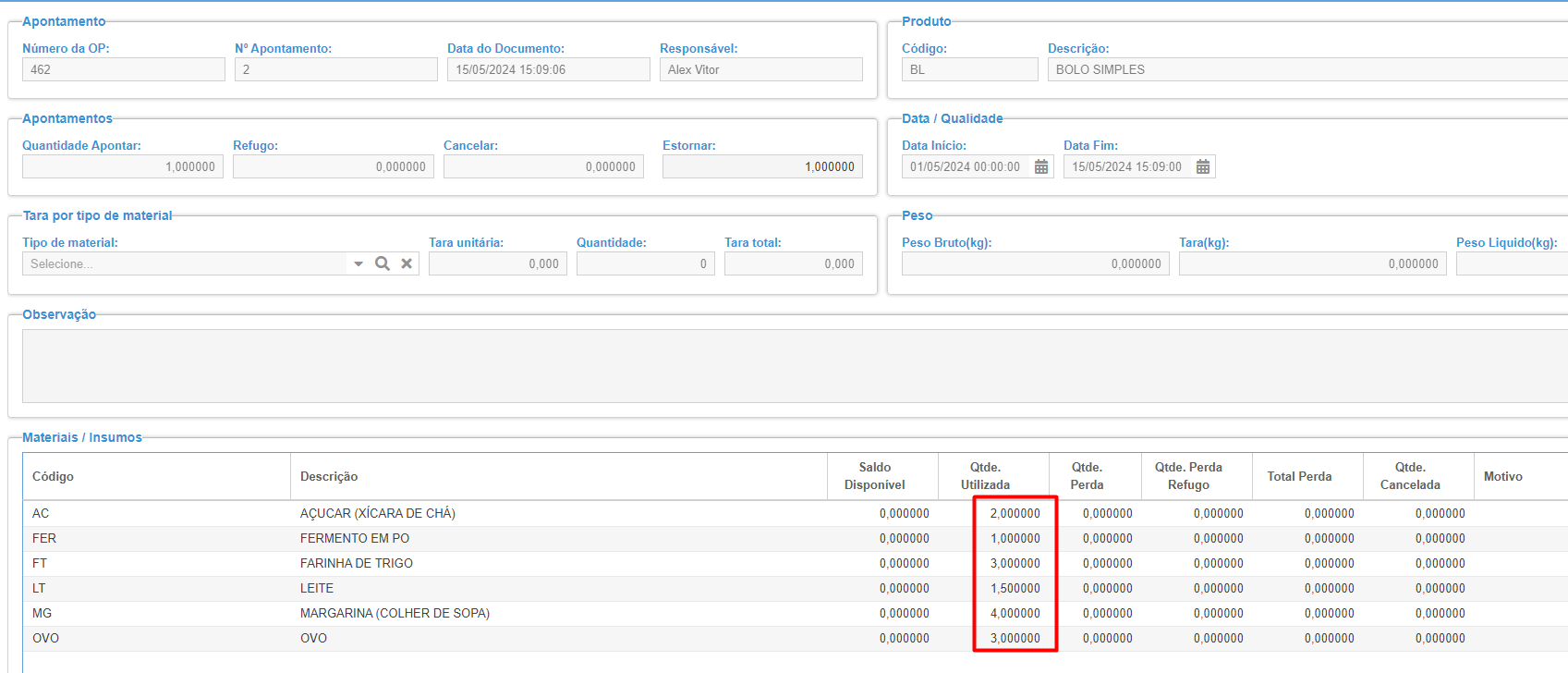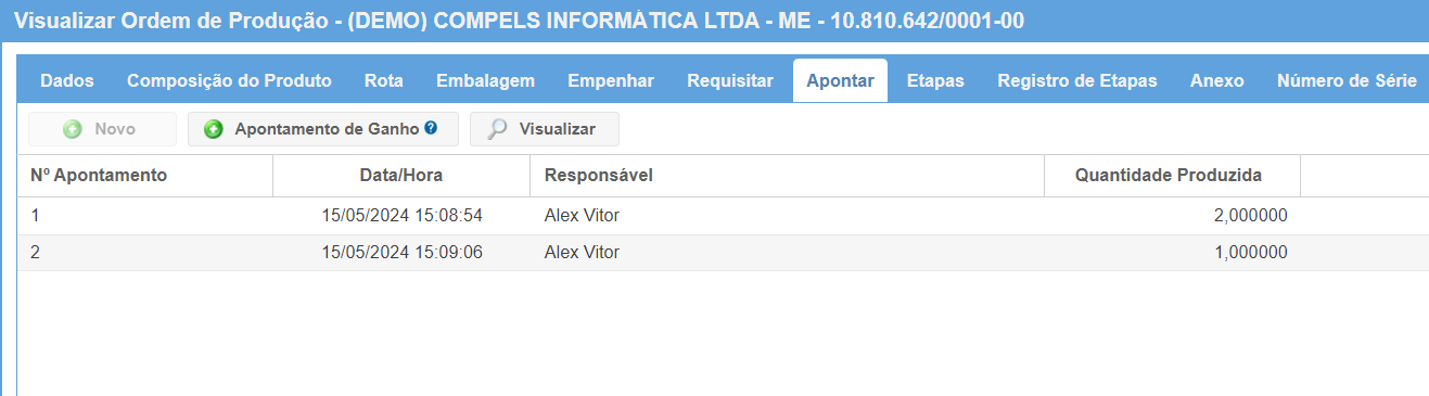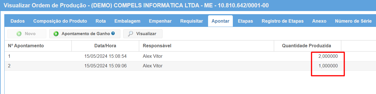 Os dois apontamentos da ordem de produção 462. Veja que na montagem desse registro, a cada apontamento da mesma ordem de produção é colocado uma barra e a sequência de apontamentos, ficando: 462/1 e 462/2.