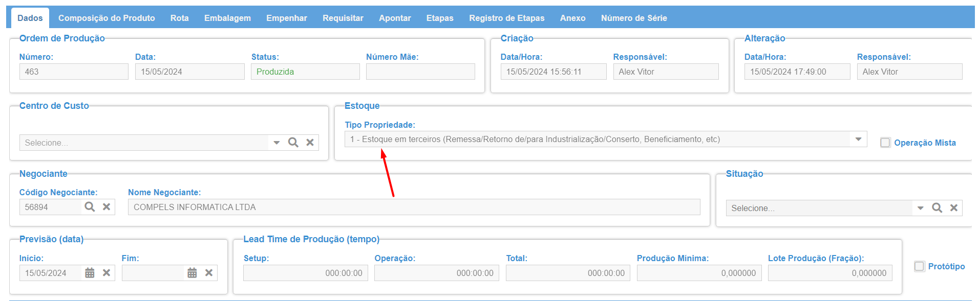 Registro K255 - Registro onde será informado todos os itens consumidos em uma ordem de produção que seja com o tipo de propriedade em terceiros, ou seja, os itens da estrutura do produto final informado no K250. No ERP Easy é possível vermos o quanto cada item consumiu acessando a ordem de produção e o detalhe dos apontamentos. Segue abaixo exemplo da ordem de produção do exemplo acima (registro K250) e como vai para o SPED.