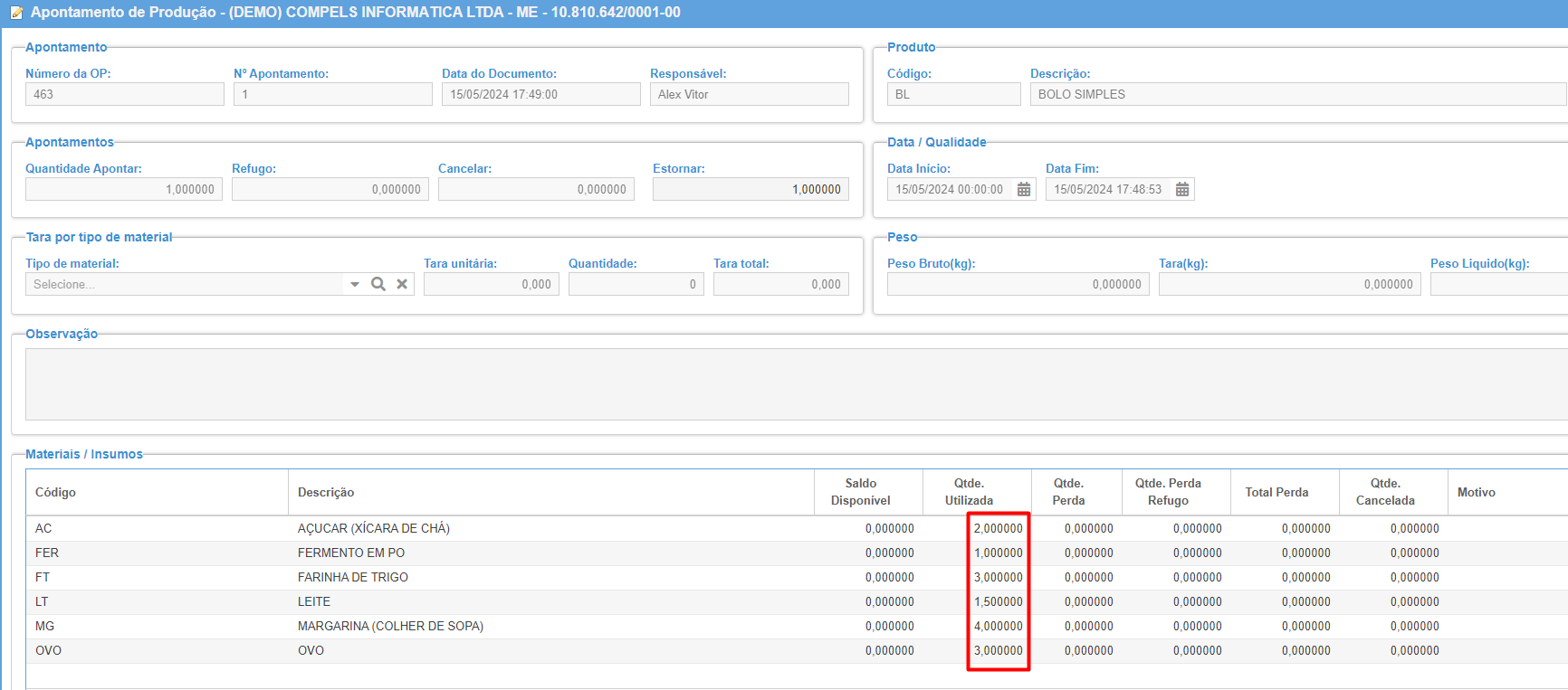 Registro K235 - Registro onde será informado todos os itens consumidos em uma ordem de produção, ou seja, os itens da estrutura do produto final informado no K230. No ERP Easy é possível vermos o quanto cada item consumiu acessando a ordem de produção e o detalhe dos apontamentos. Segue abaixo exemplo da ordem de produção do exemplo acima (registro K230) e como vai para o SPED.