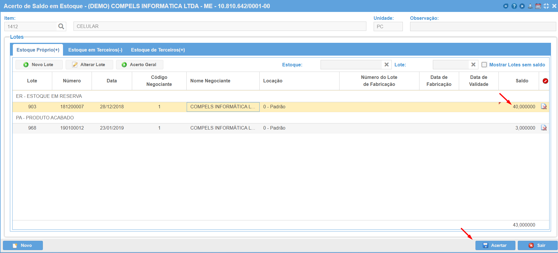 Vamos diminuir o saldo para 40 e ao clicar em "Acertar", aparecerá a mensagem se é para incluir no registro K280. Vamos clicar em "Sim".