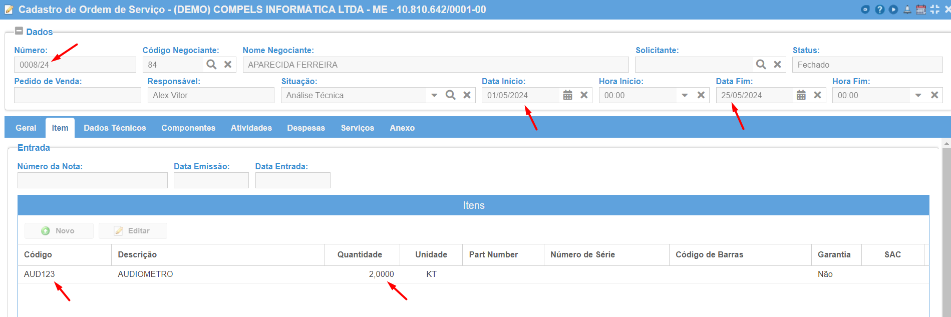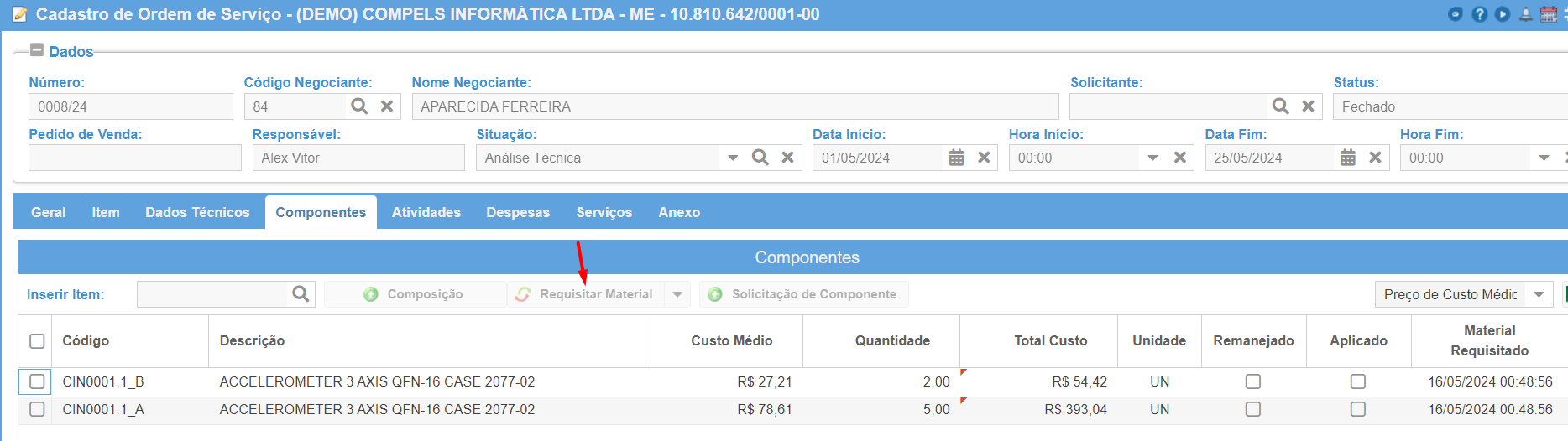 Tela dos componentes em uma ordem de serviço, já requisitados.