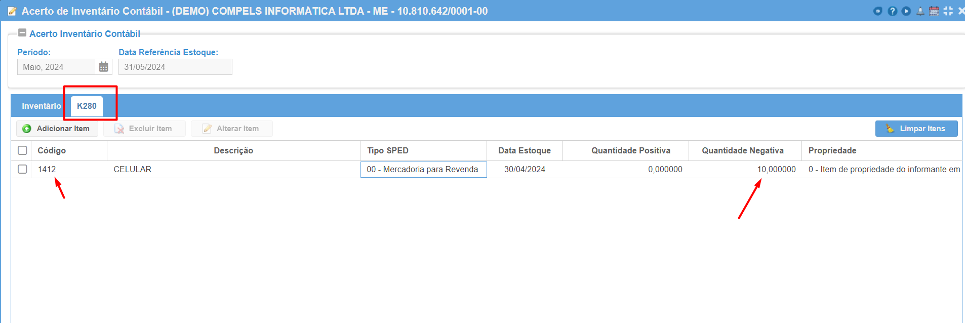 Se acessarmos a funcionalidade "Acerto de Inventário Contábil", irmos no inventário do mês que vamos gerar o SPED e ir na aba "K280", o item que fizemos o acerto manualmente deve constar no inventário com a quantidade negativa de 10 unidades.