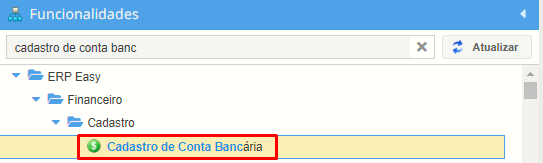 O primeiro passo é informar as configurações necessárias no Cadastro de Conta Bancária, para isso acesse a seguinte funcionalidade: