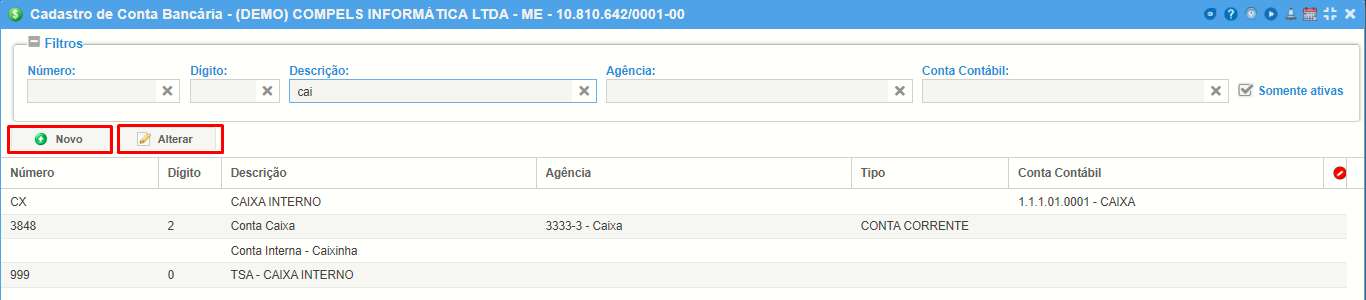 A seguinte tela será apresentada onde você poderá ver todos os bancos cadastrados. Caso não haja o cadastro do banco desejado, clique em "Novo" para inserir, mas se houver então selecione o cadastro e clique em "Alterar" para inserir as configurações de emissão de cobrança.