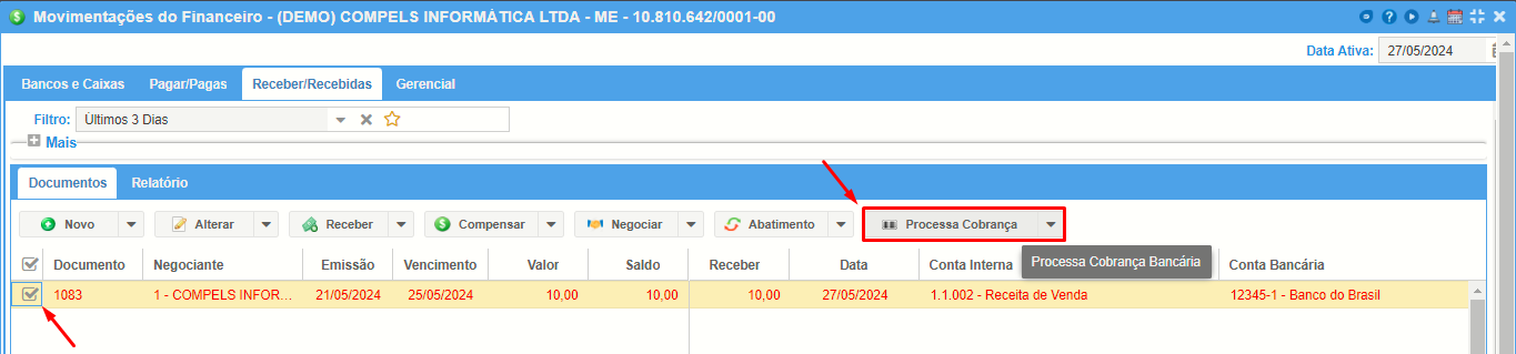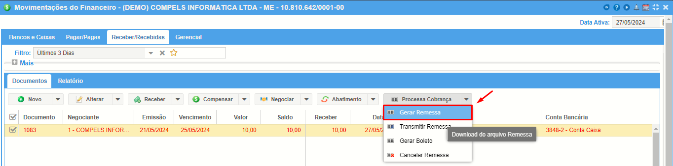 Após o processamento, selecione a duplicata na seta ao lado do botão "Processar Cobrança", clique na opção "Gerar Remessa".
