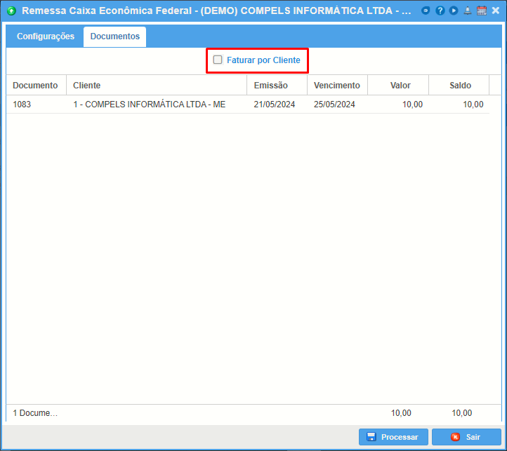 A aba Documentos serve para visualizar todos os títulos que serão gerados no arquivo remessa, esta aba serve apenas para conferência, caso alguma informação esteja divergente deve-se alterar na duplicata.