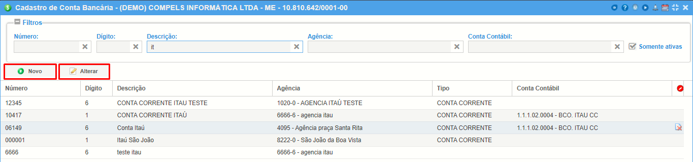 A seguinte tela será apresentada onde você poderá ver todos os bancos cadastrados. Caso não haja o cadastro do banco desejado, clique em "Novo" para inserir, mas se houver então selecione o cadastro e clique em "Alterar" para inserir as configurações de emissão de cobrança.