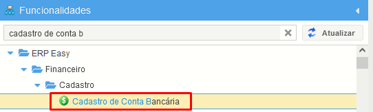 O primeiro passo é informar as configurações necessárias no Cadastro de Conta Bancária, para isso acesse a seguinte funcionalidade: