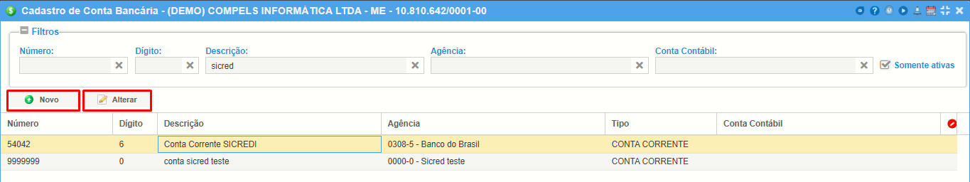 A seguinte tela será apresentada onde você poderá ver todos os bancos cadastrados. Caso não haja o cadastro do banco desejado, clique em "Novo" para inserir, mas se houver então selecione o cadastro e clique em "Alterar" para inserir as configurações de emissão de cobrança.