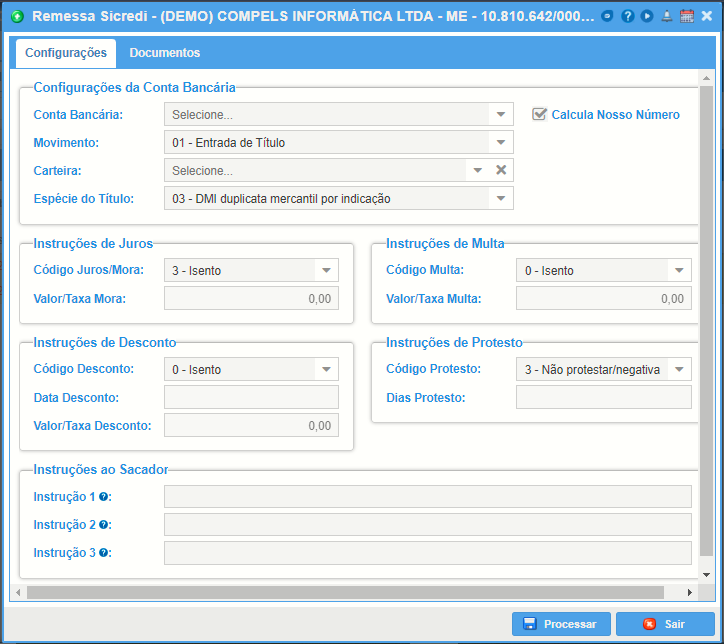 Em seguida deve-se configurar, conforme passado pelo gerente da conta, as informações de Juros, Multa, Desconto, Protesto e Instruções do boleto.