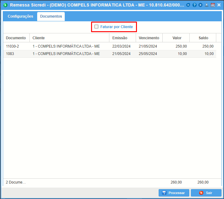 - Faturar por cliente: se esta opção for selecionada somente 1 boleto será gerado e neste boleto será somado todas as duplicatas do mesmo cliente, caracterizando uma fatura. Com o uso desta função a empresa pode economizar nas taxas bancárias, uma vez que as taxas são cobradas por boletos. Caso esteja desmarcada será gerado um boleto para cada duplicata.