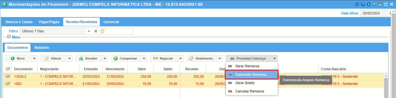 Obs:. Após a cobrança bancária processada, se utilizar da cobrança online, poderá ser realizada a transmissão desta remessa diretamente para o banco, conforme mostra a imagem abaixo.