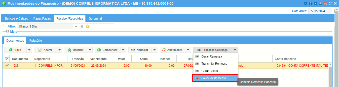 Obs:. A opção de cancelar remessa no sistema não realiza o cancelamento no banco, então será necessário entrar em contato com a agência.