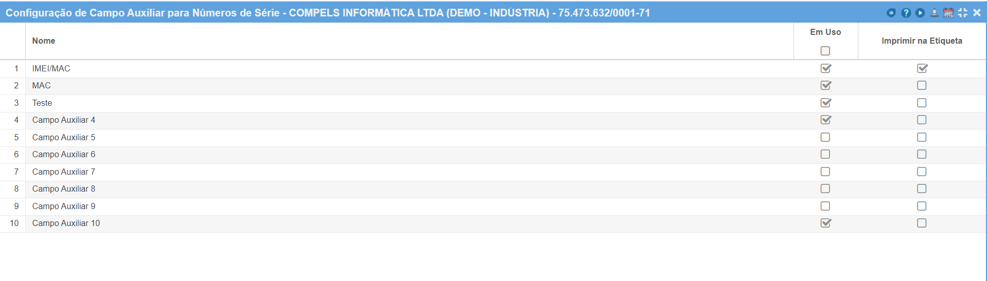 Será possível inserir até 10 campos auxiliares para cada NS. Altere o nome do campo, marque se está em uso e apenas uma campo poderá ser selecionado para ser impresso junto à etiqueta do NS.