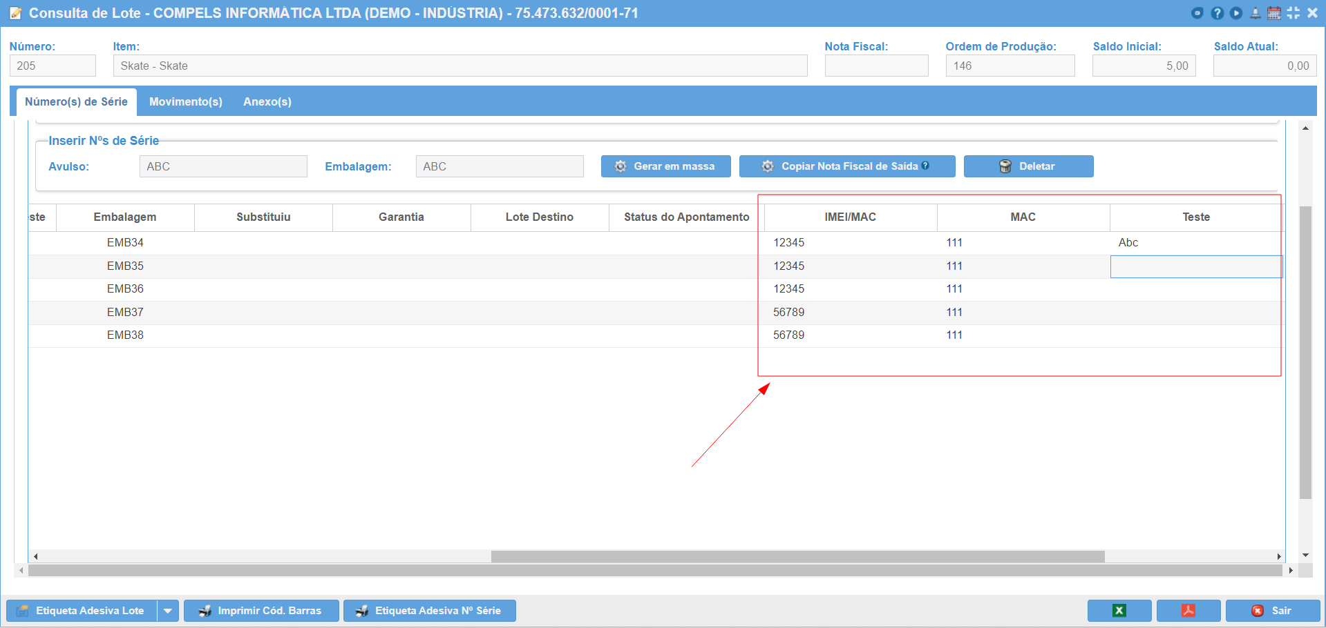 Na consulta de lote, insera o valor do campo auxiliar para cada NS.