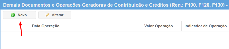 Para lançar novos valores, acesse a funcionalidade "Demais Documentos e Operações Geradoras de Contribuição e Créditos (Reg.: F100, F120, F130)" e clique no botão NOVO.