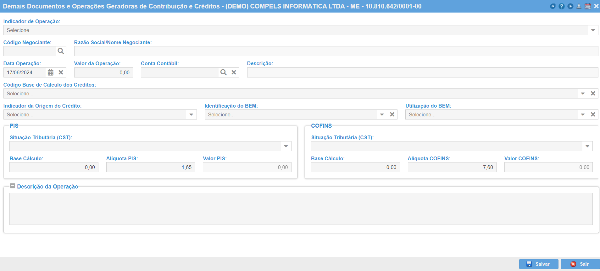 Descrição da Operação: Campo para informar a descrição complementar da operação ou do item.