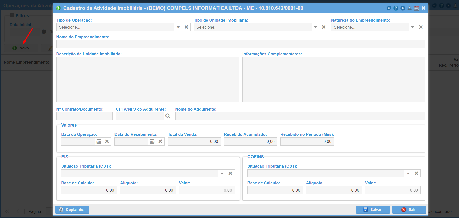 Para lançar novos valores, acesse a funcionalidade "Operações da atividade imobiliária" e clique no botão NOVO.
