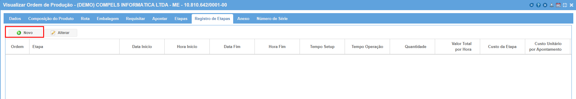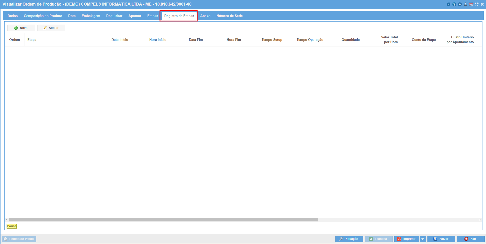 A Aba de Registro de Etapas é um complemento da aba de Etapa (para acessar o manual da aba Etapa clique aqui), ambas localizadas no cadastro da Ordem de Produção, onde é possível registrar as etapas concluídas durante o processo produtivo, com suas datas de início e fim, além dos tempos de setup (preparação pro início da etapa) e de operação (realização da etapa em si). Também é possível registrar suas pausas e motivo delas, bem como ter uma visão do custo de cada etapa apontada.