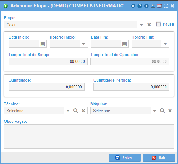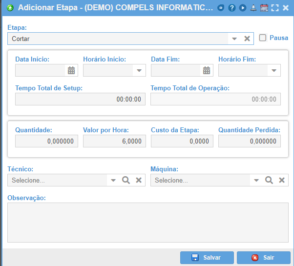 Com a etapa selecionada basta escolher as datas e horários de início e fim e o sistema calculará o tempo total de operação. Também é possível preencher o tempo de setup, a quantidade do item produzido na etapa, quantidade de item perdida na etapa (opcional) e o valor/hora e custo da etapa. Caso as informações de custo já tenham sido preenchidas no Cadastro da Etapa, o sistema irá trazer o valor automaticamente, porém ele também pode ser alterado manualmente se necessário. Os campos restantes não são obrigatórios. Depois de preenchidos basta salvar.