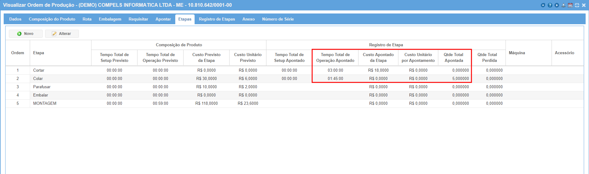 Conforme os apontamentos vão sendo realizados, o sistema irá atualizar a aba de ETAPA para mostrar os tempos e custos de cada etapa que vai sendo apontada e para que o usuário tenha um comparativo do tempo e custo previsto com o tempo e custo realizado.