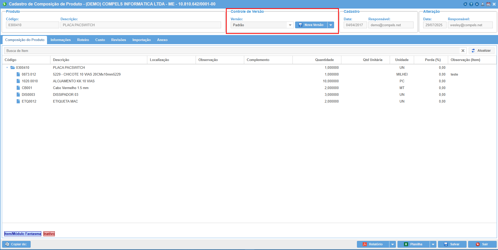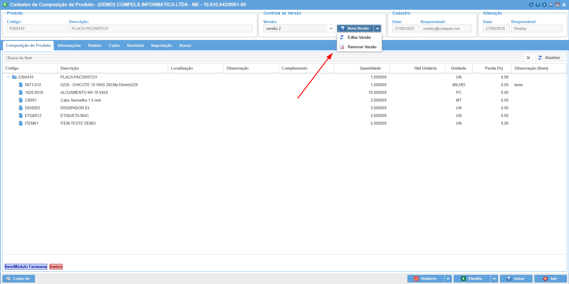 Nas composições de produto, é possível criar e controlar versões da mesma composição, quando há a necessidade de alterar insumos específicos sem que seja necessário criar uma composição totalmente nova. Com o controle de versão, é possível ter relações de insumos diferentes para o mesmo código de composição e utilizá-las conforme a necessidade para as ordens de produção. Para criar uma nova versão de composição, acesse a opção NOVA VERSÃO dentro do cadastro da composição: