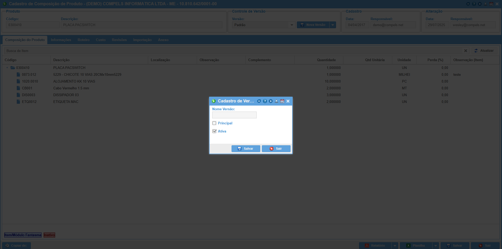 O nome da versão pode ser preenchido de maneira livre. A opção principal diz respeito a qual versão será mostrada primeiro por padrão para novas ordens de produção, e a opção ativa informa se aquela versão atualmente se encontra disponível para uso nas OPs. Se uma versão não for marcada como ativa, não será possível escolher o uso dela nas ordens de produção. Ao final basta salvar e a nova versão será criada.