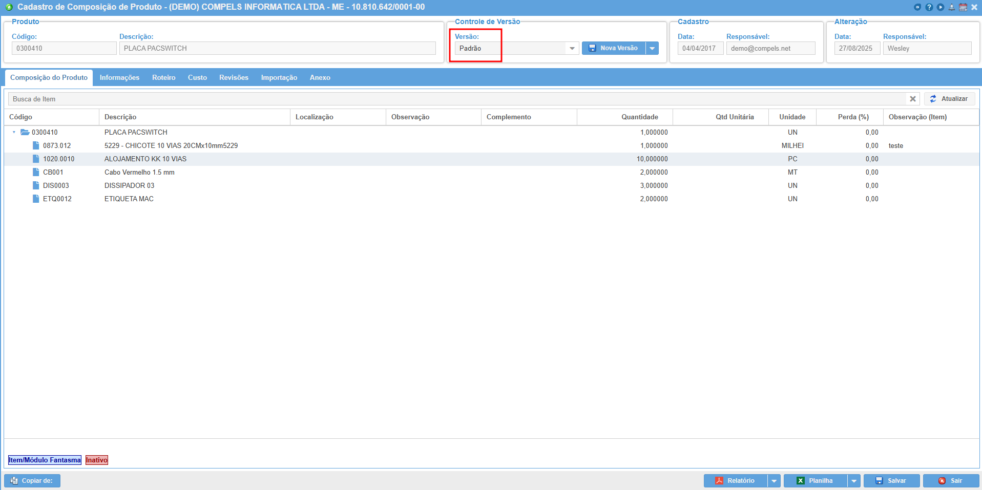 Ao selecionar versões diferentes, o sistema irá mostrar os insumos presentes em cada uma delas. Abaixo um exemplo: