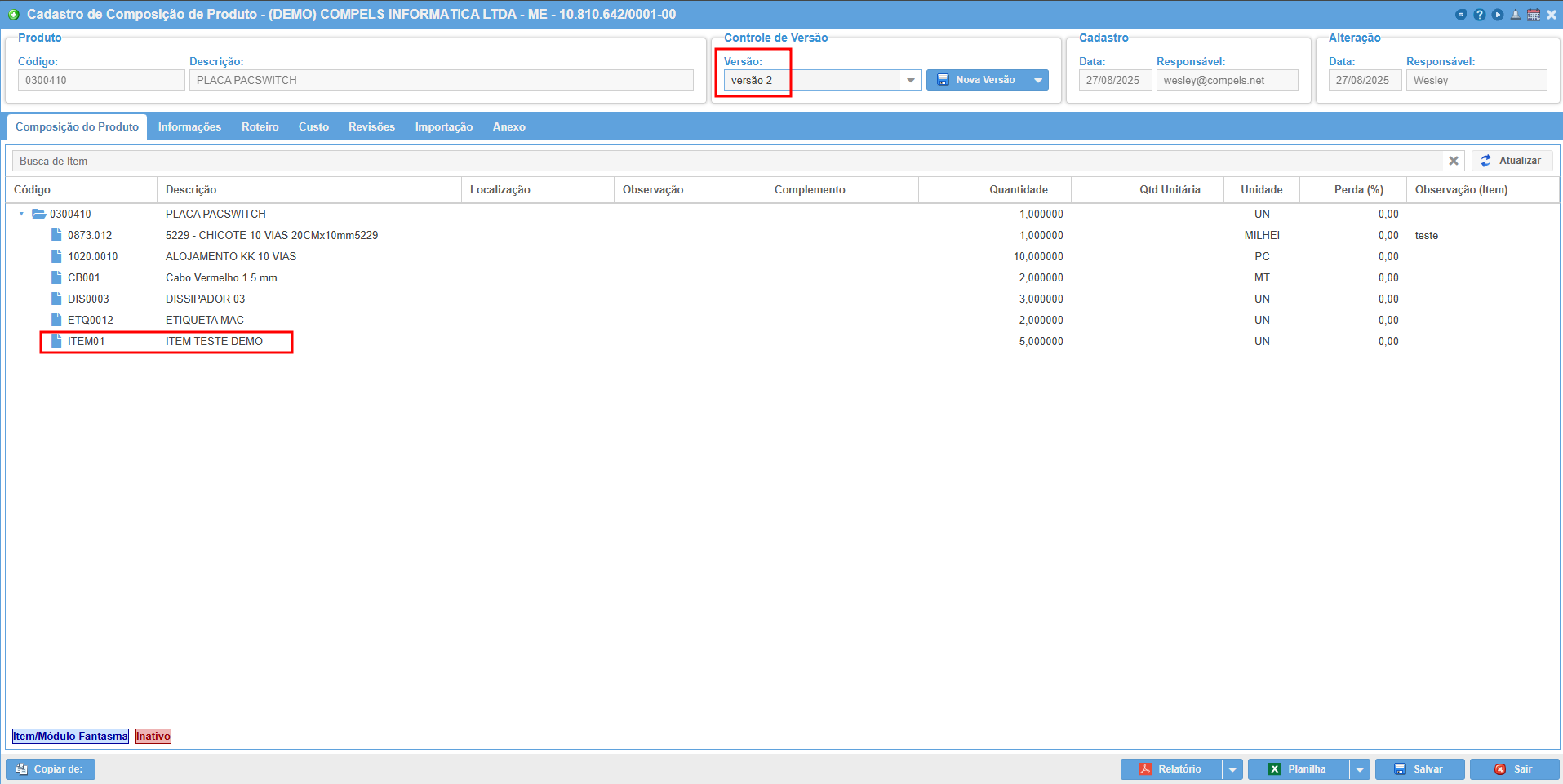 Versão secundária, com o nome "versão 2". Note que nessa versão existe um item adicional que não está presente na versão principal. Ao selecionar versões diferentes, o sistema mostra os insumos da versão selecionada.