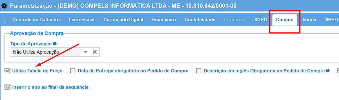 Vá na aba "Compra" e marque a opção Utiliza Tabela de Preço.